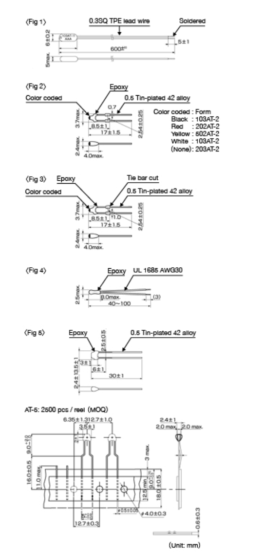 The AT series thermistor features high accuracy with tight resistance and B-value tolerances (±1%). – Uniform shape facilitates automated assembly – Long term reliability SEMITEC’S AT thermistors are fully compliant with RoHS DIRECTIVE2011/65/EU.